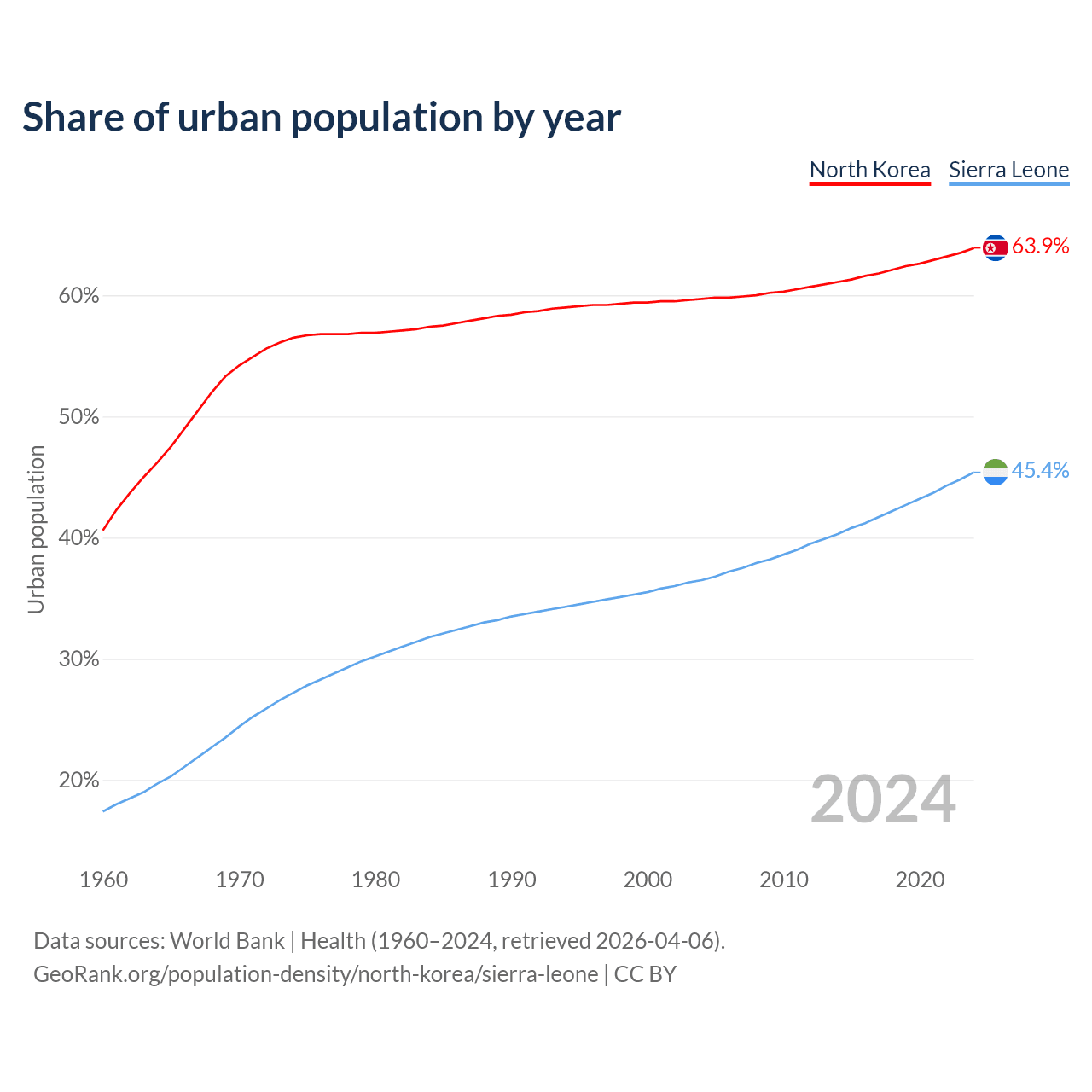 From 2004 to 2024, the share of urban population changed from 59.7% to 63.9% in North Korea and from 36.5% to 45.4% in Sierra Leone.