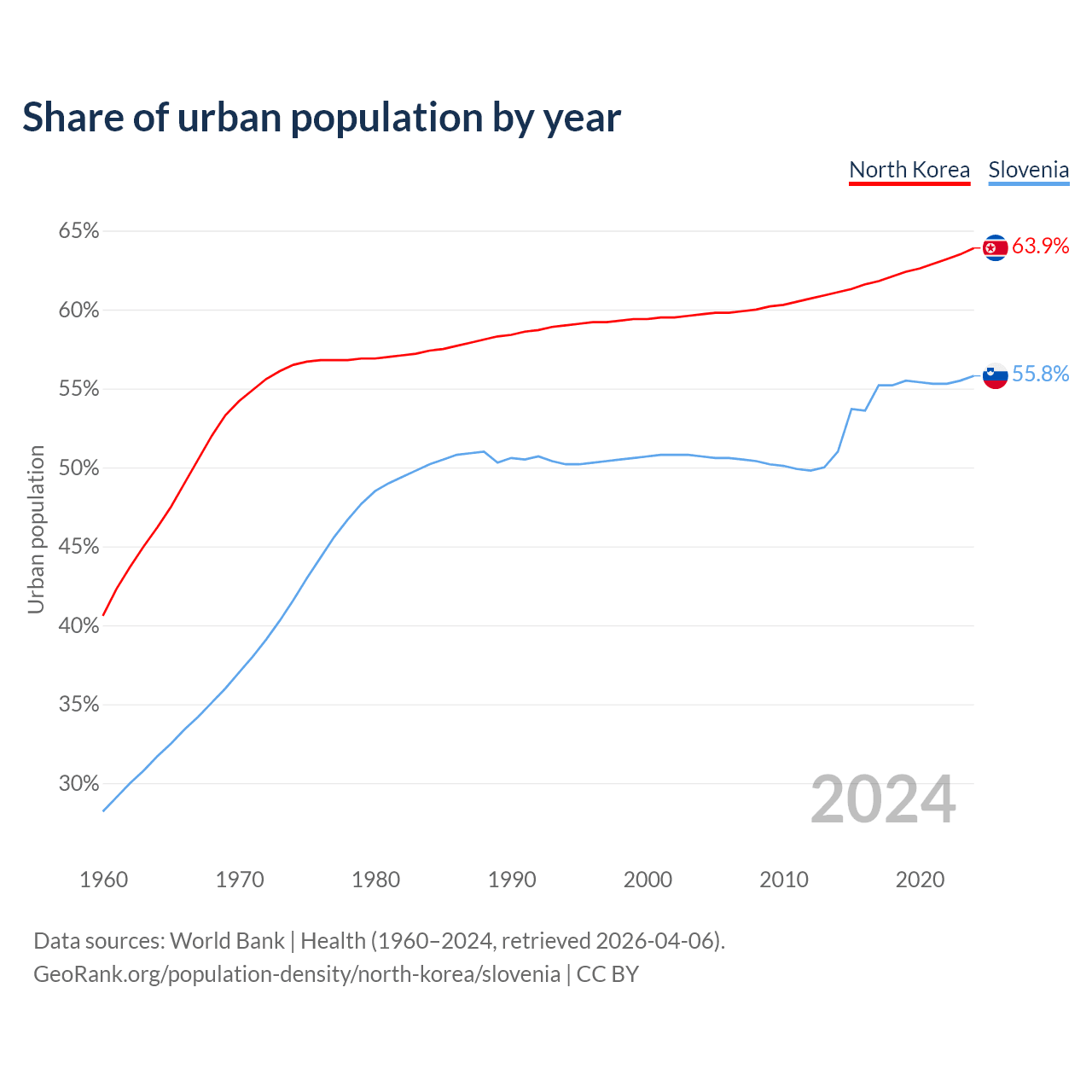 From 2004 to 2024, the share of urban population changed from 59.7% to 63.9% in North Korea and from 50.7% to 55.8% in Slovenia.