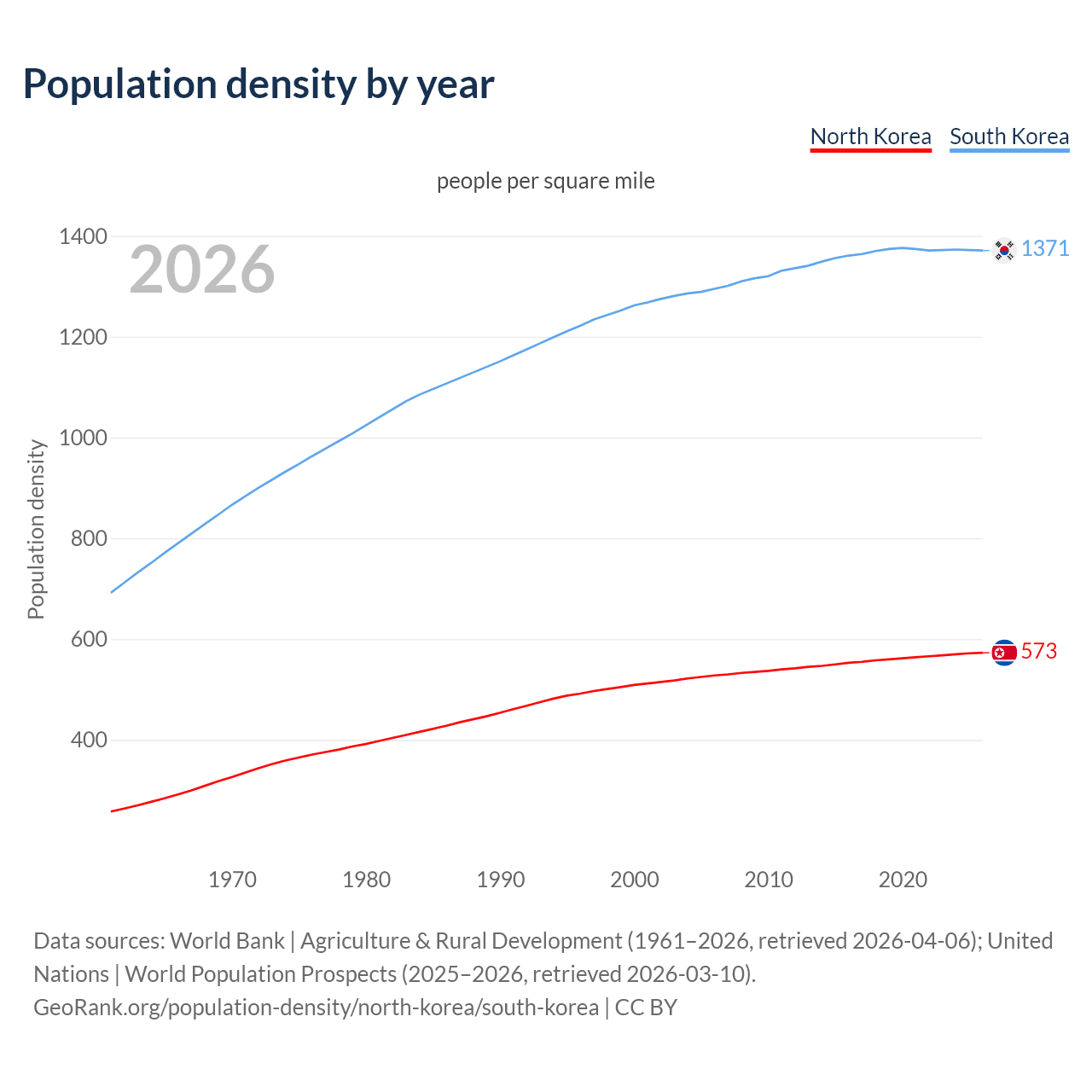 From 2006 to 2026, population density in North Korea increased by 8.64%, compared to a 5.84% growth in South Korea.