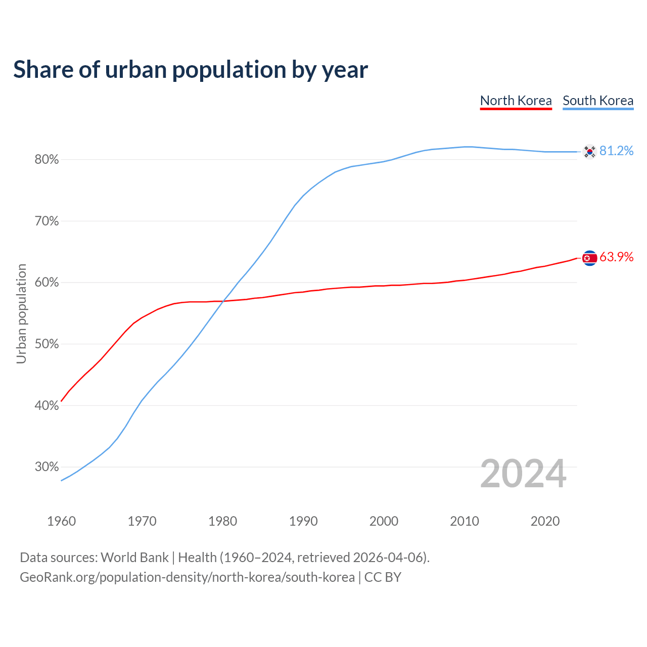 From 2004 to 2024, the share of urban population changed from 59.7% to 63.9% in North Korea and from 81.1% to 81.2% in South Korea.