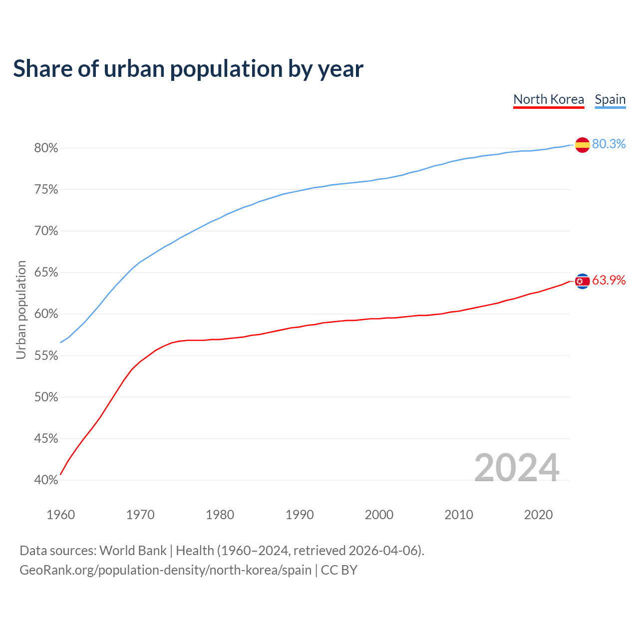 From 2004 to 2024, the share of urban population changed from 59.7% to 63.9% in North Korea and from 77% to 80.3% in Spain.