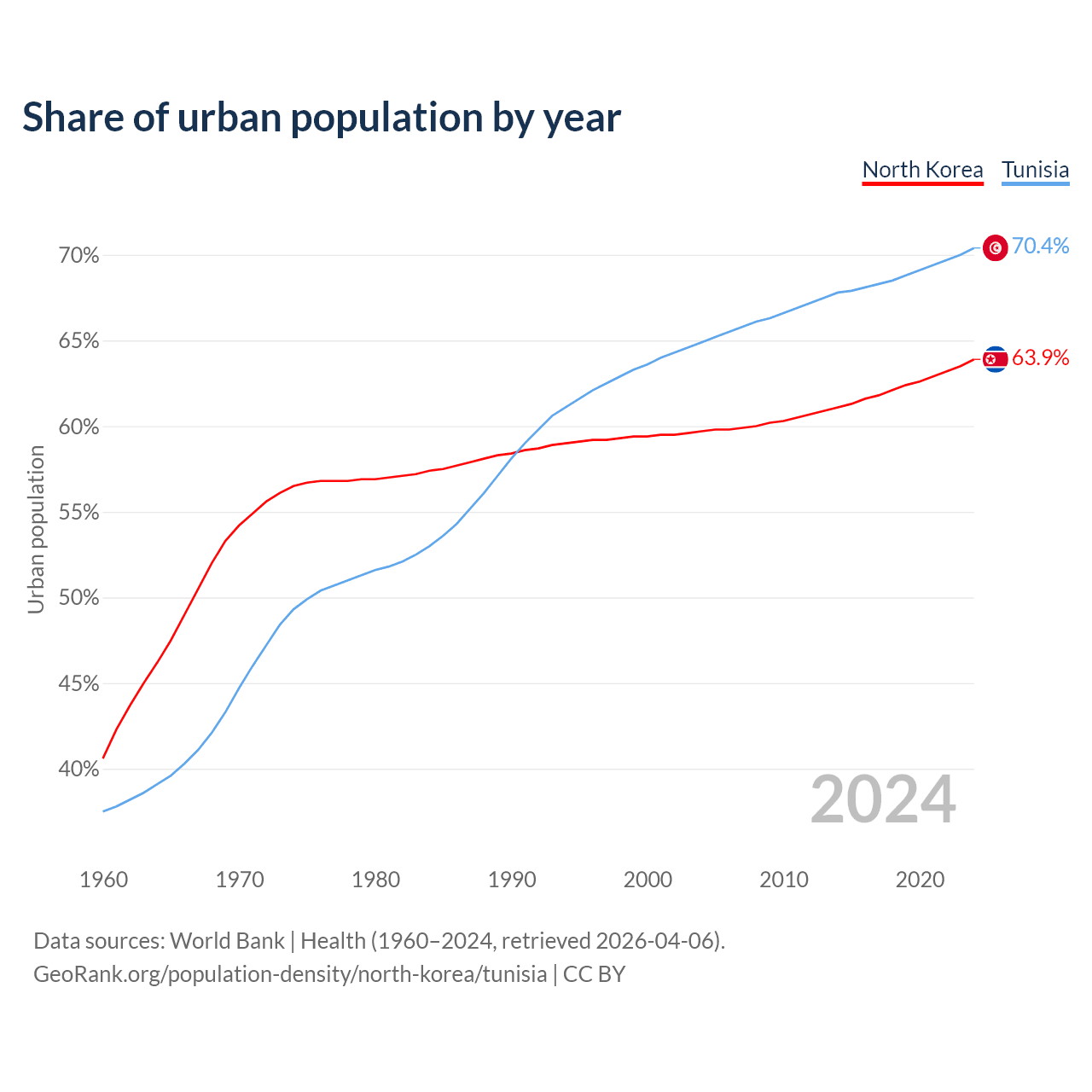 From 2004 to 2024, the share of urban population changed from 59.7% to 63.9% in North Korea and from 64.9% to 70.4% in Tunisia.
