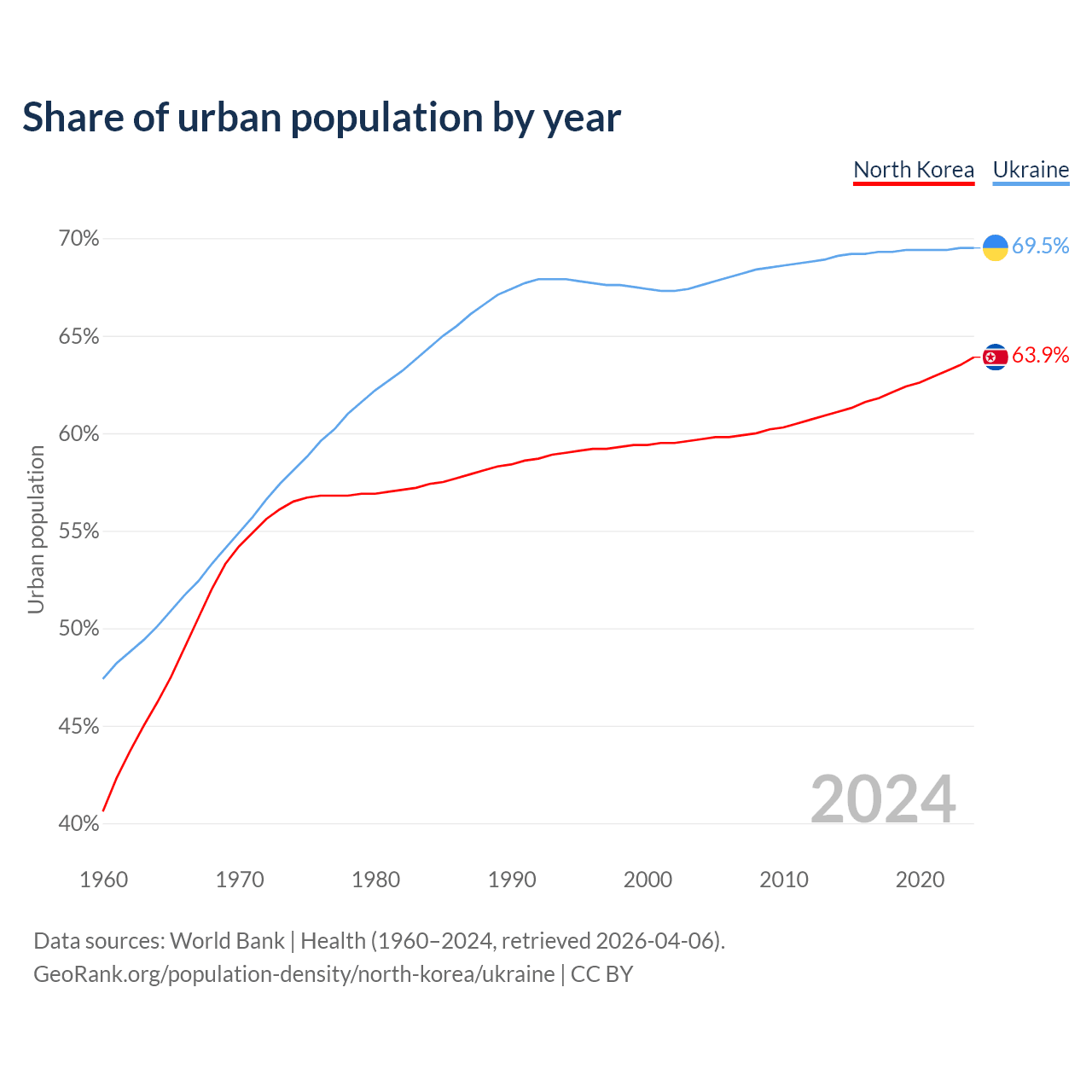 From 2004 to 2024, the share of urban population changed from 59.7% to 63.9% in North Korea and from 67.6% to 69.5% in Ukraine.