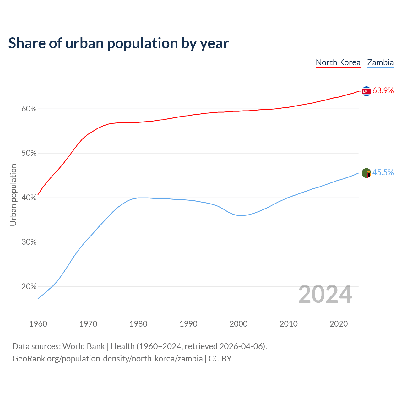 From 2004 to 2024, the share of urban population changed from 59.7% to 63.9% in North Korea and from 36.8% to 45.5% in Zambia.