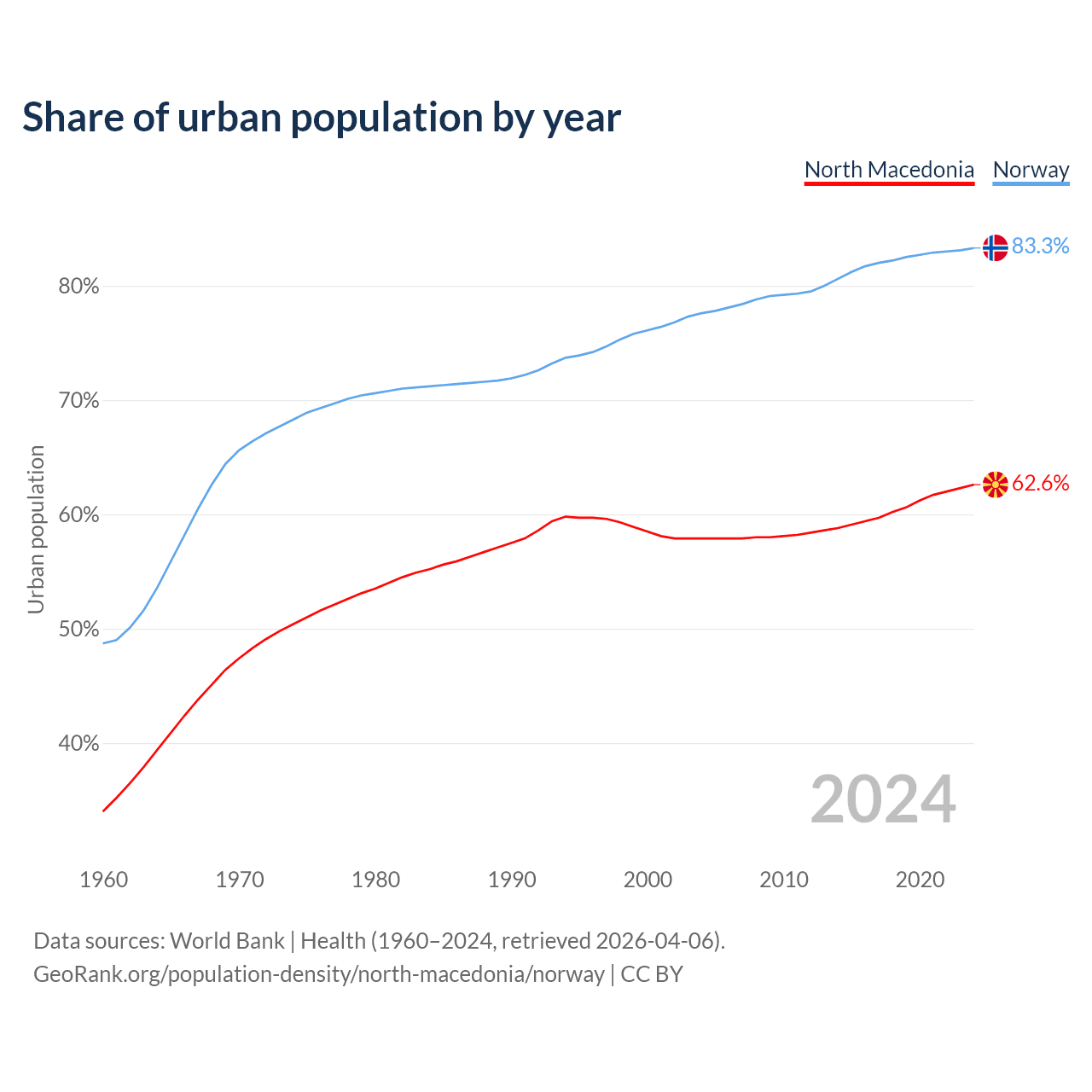 From 2004 to 2024, the share of urban population changed from 57.9% to 62.6% in North Macedonia and from 77.6% to 83.3% in Norway.
