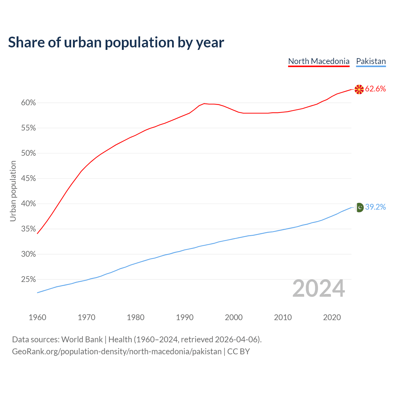 From 2004 to 2024, the share of urban population changed from 57.9% to 62.6% in North Macedonia and from 33.7% to 39.2% in Pakistan.