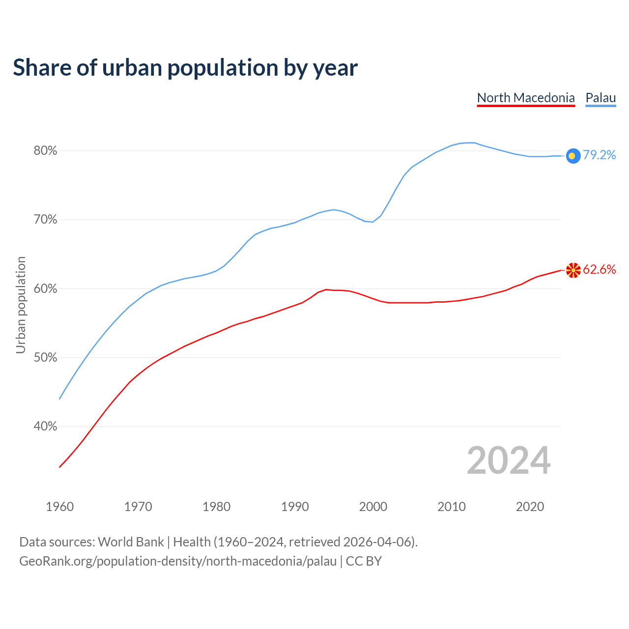 From 2004 to 2024, the share of urban population changed from 57.9% to 62.6% in North Macedonia and from 76.4% to 79.2% in Palau.