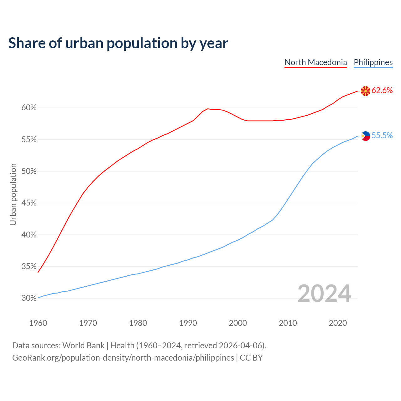From 2004 to 2024, the share of urban population changed from 57.9% to 62.6% in North Macedonia and from 40.9% to 55.5% in the Philippines.