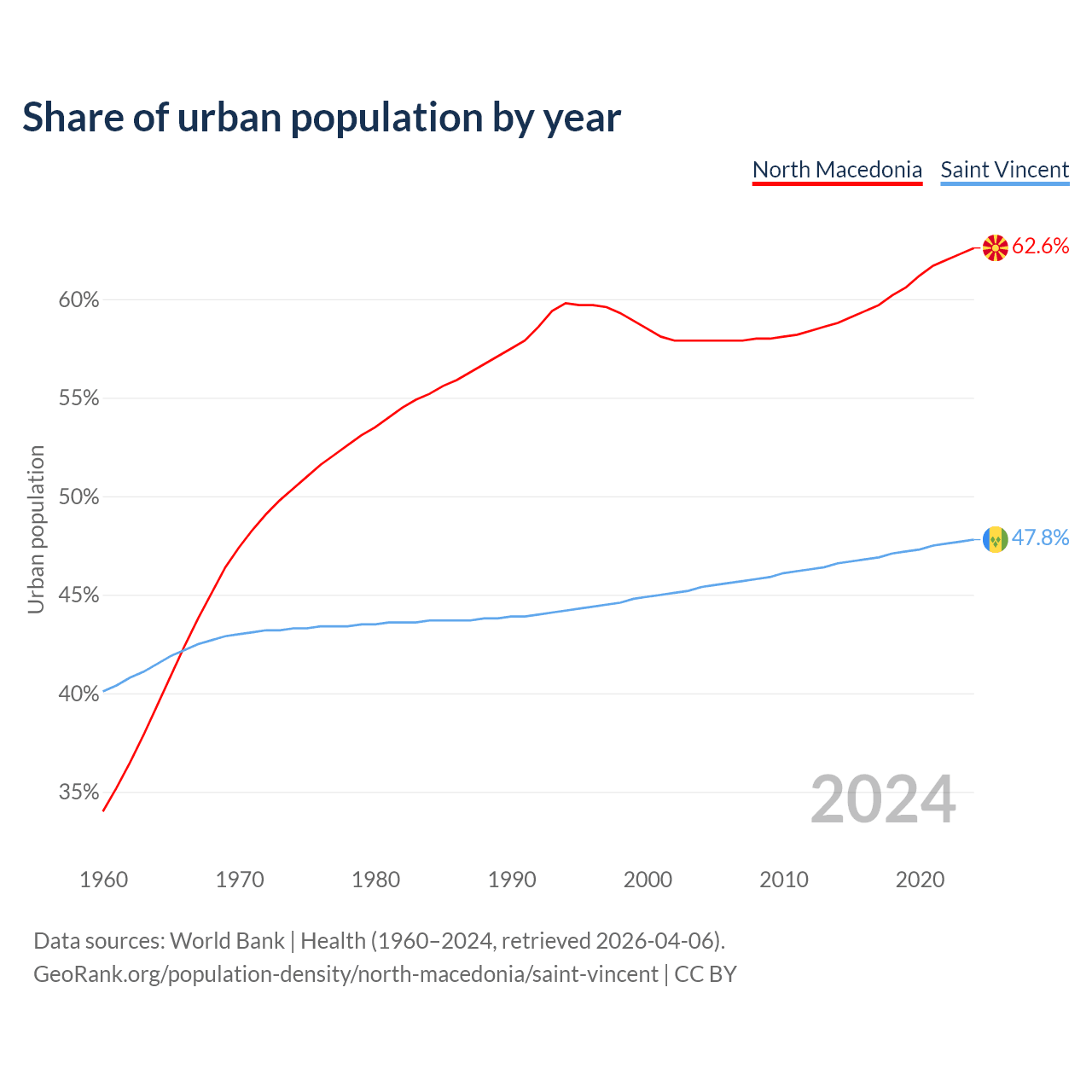 From 2004 to 2024, the share of urban population changed from 57.9% to 62.6% in North Macedonia and from 45.4% to 47.8% in Saint Vincent.