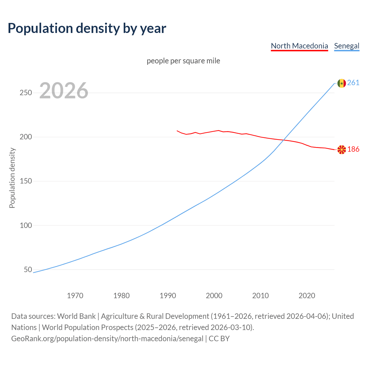 From 2006 to 2026, population density in North Macedonia decreased by 8.69%, compared to a 68.5% growth in Senegal.