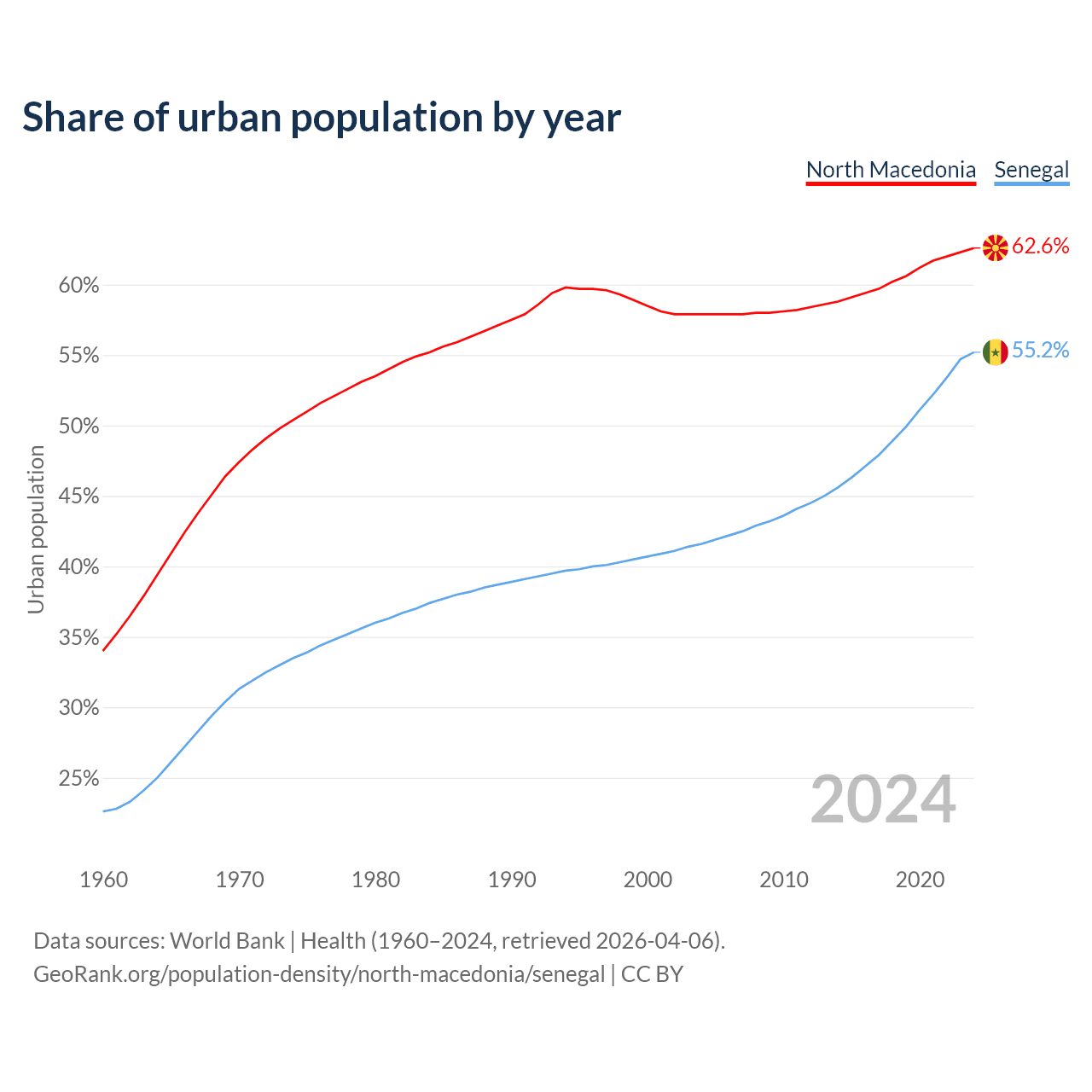 From 2004 to 2024, the share of urban population changed from 57.9% to 62.6% in North Macedonia and from 41.6% to 55.2% in Senegal.