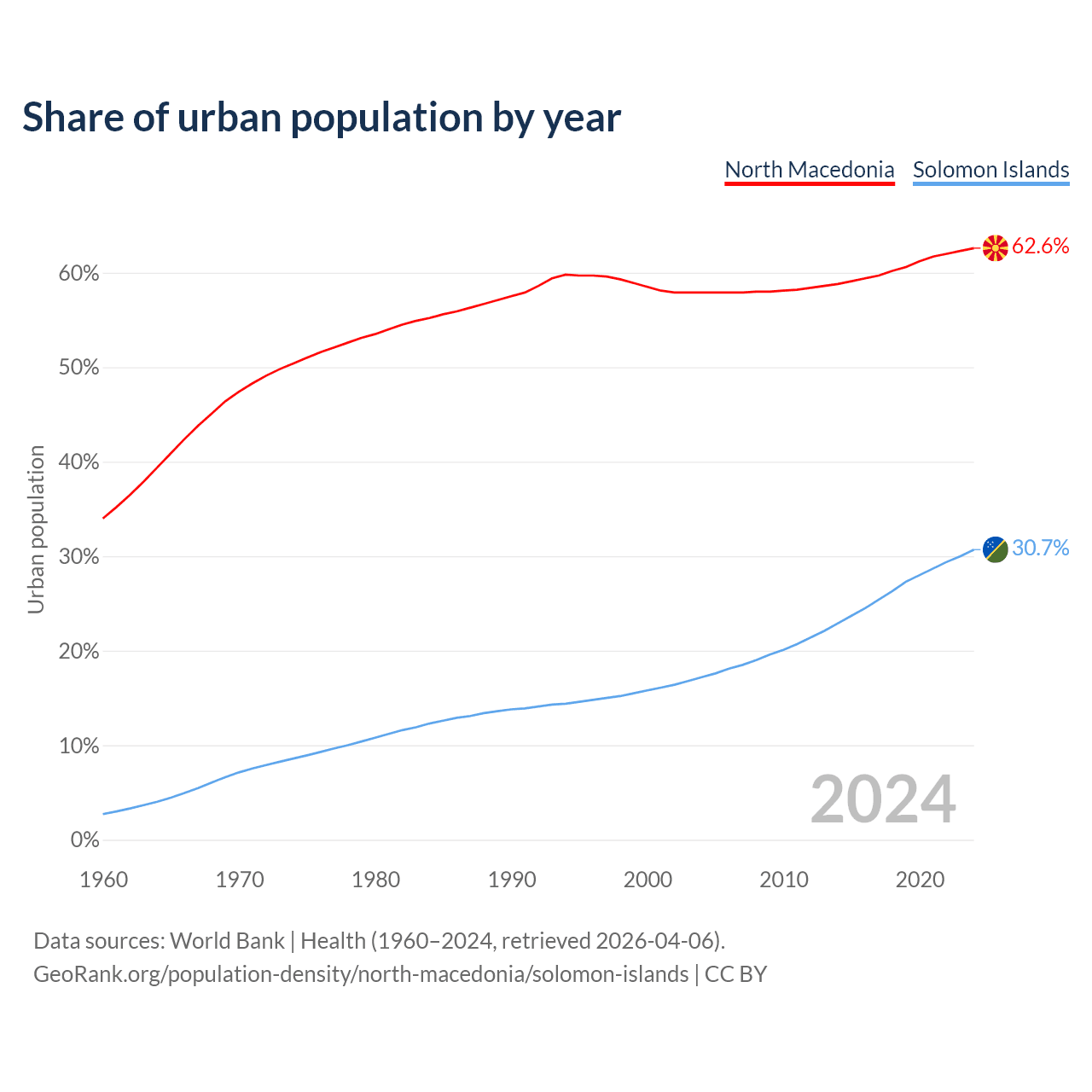 From 2004 to 2024, the share of urban population changed from 57.9% to 62.6% in North Macedonia and from 17.2% to 30.7% in the Solomon Islands.