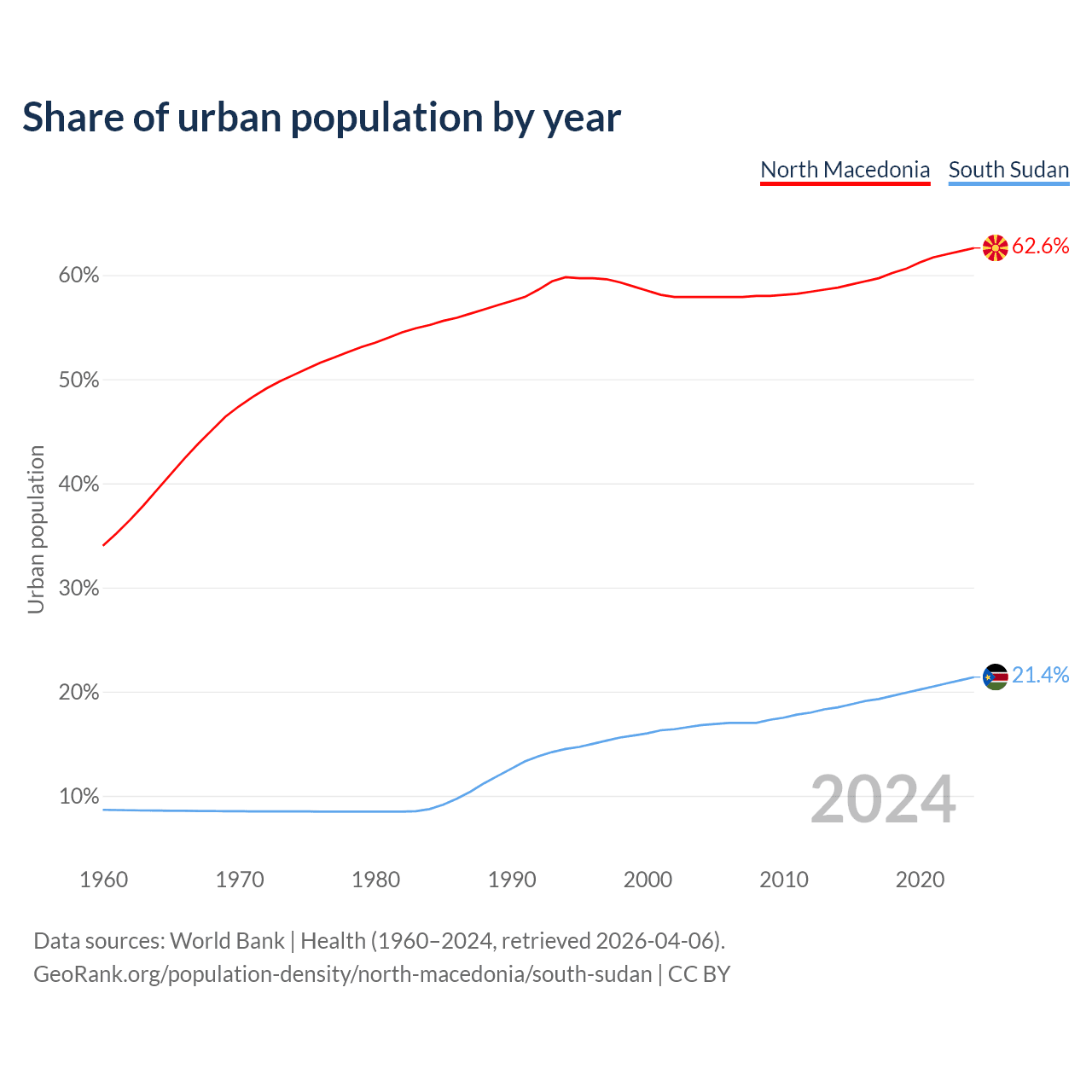 From 2004 to 2024, the share of urban population changed from 57.9% to 62.6% in North Macedonia and from 16.8% to 21.4% in South Sudan.