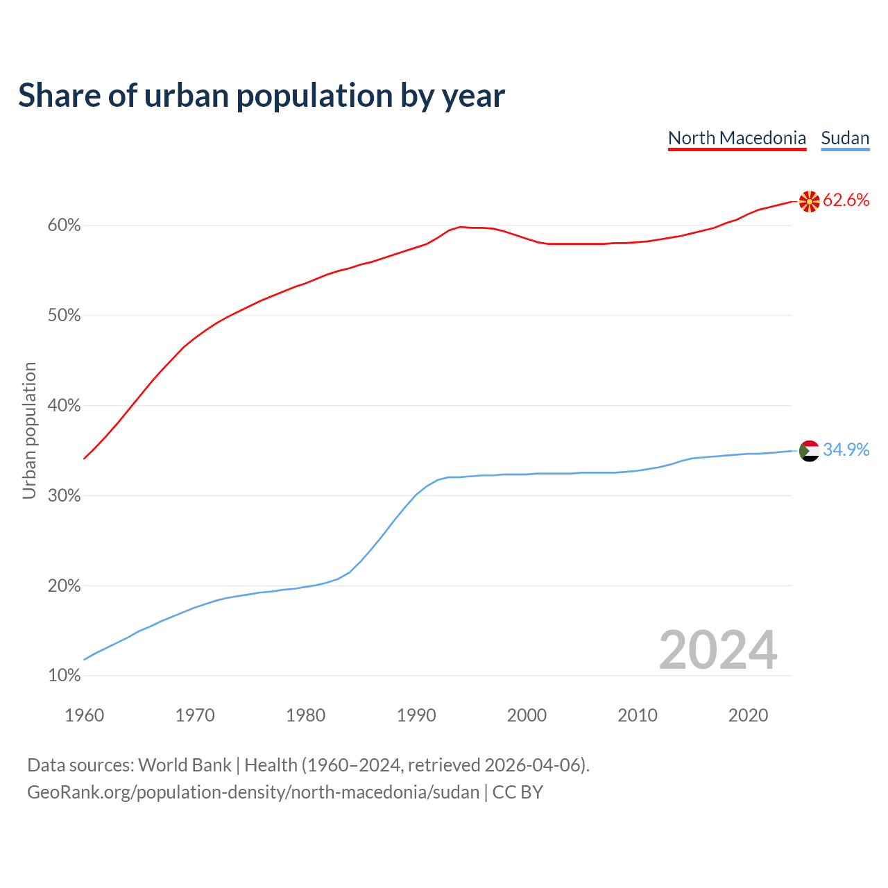 From 2004 to 2024, the share of urban population changed from 57.9% to 62.6% in North Macedonia and from 32.4% to 34.9% in Sudan.