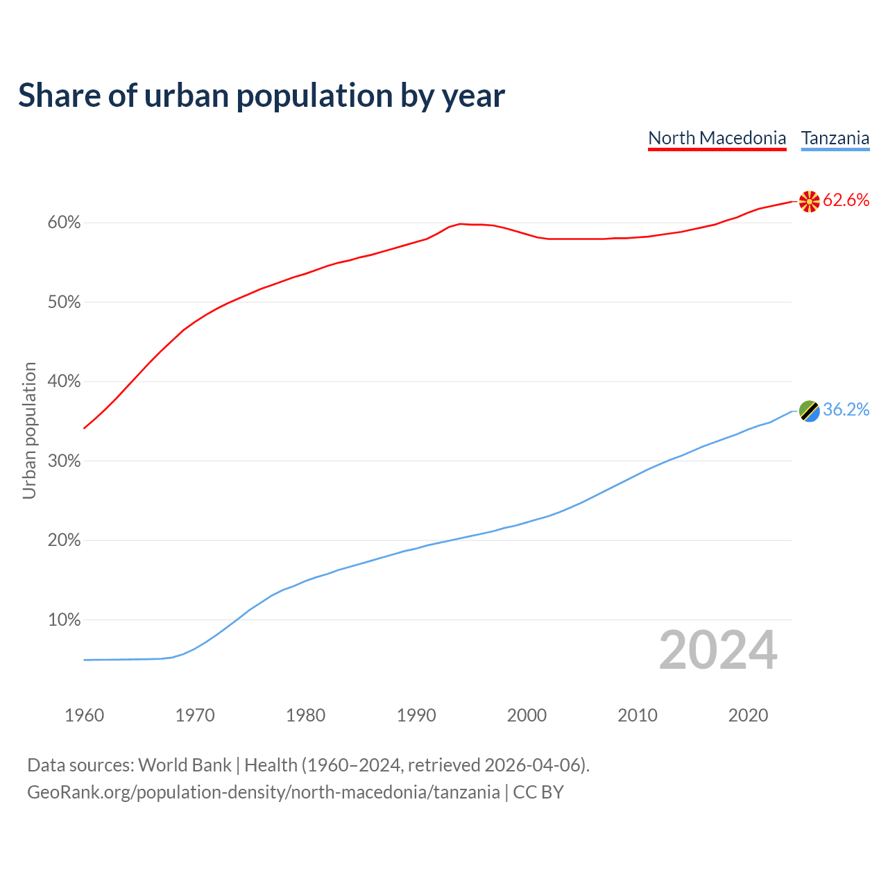 From 2004 to 2024, the share of urban population changed from 57.9% to 62.6% in North Macedonia and from 24.1% to 36.2% in Tanzania.
