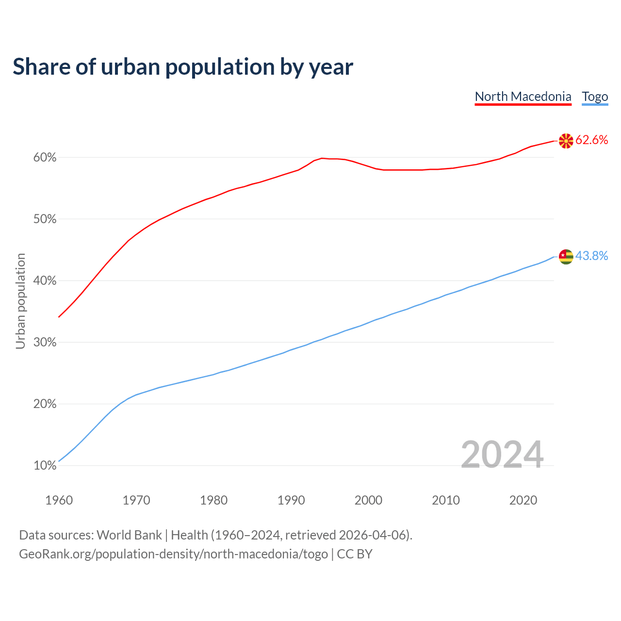 From 2004 to 2024, the share of urban population changed from 57.9% to 62.6% in North Macedonia and from 34.9% to 43.8% in Togo.