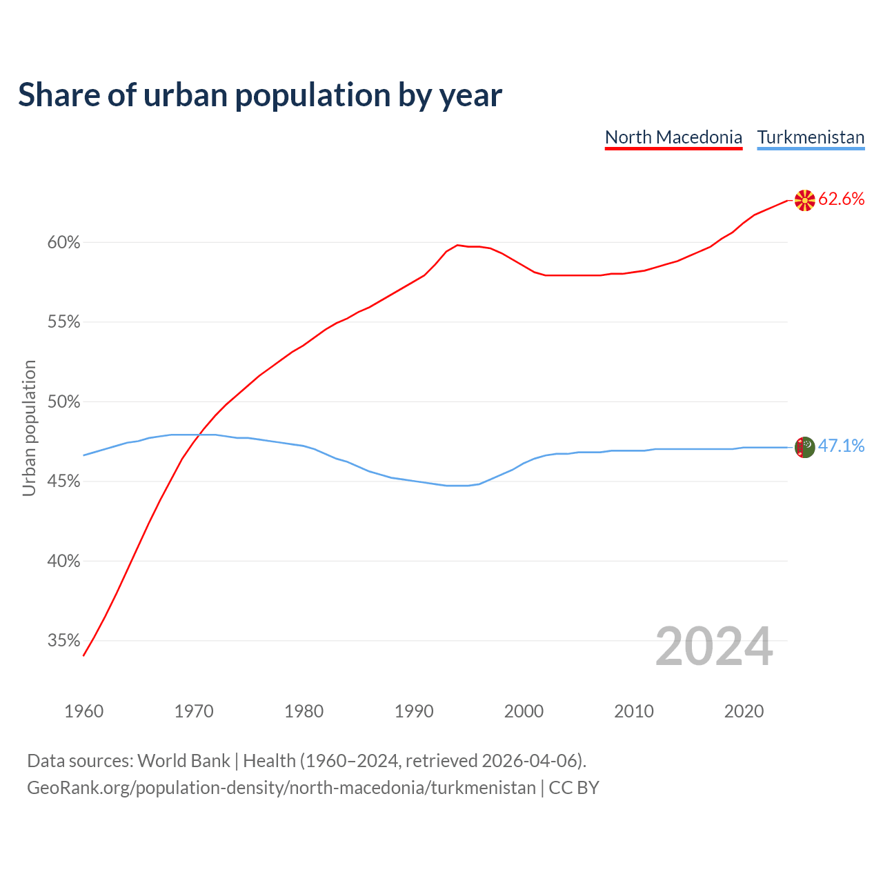 From 2004 to 2024, the share of urban population changed from 57.9% to 62.6% in North Macedonia and from 46.7% to 47.1% in Turkmenistan.