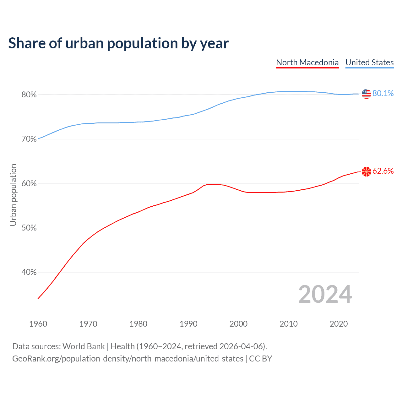 From 2004 to 2024, the share of urban population changed from 57.9% to 62.6% in North Macedonia and from 80% to 80.1% in the United States.