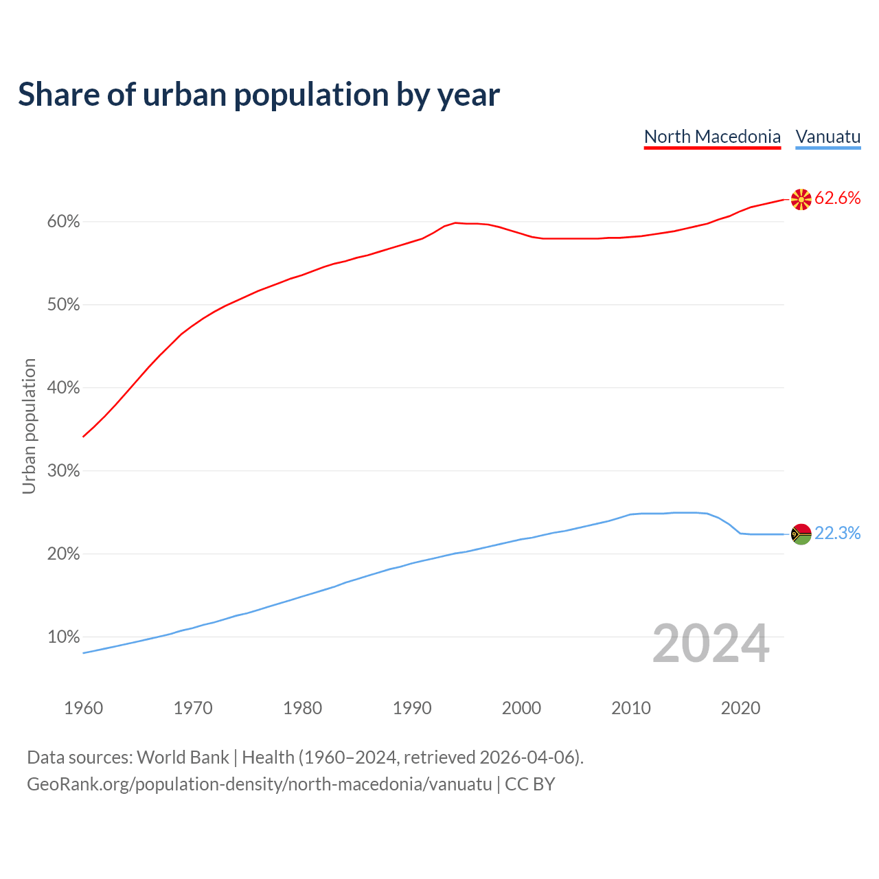 From 2004 to 2024, the share of urban population changed from 57.9% to 62.6% in North Macedonia and from 22.7% to 22.3% in Vanuatu.