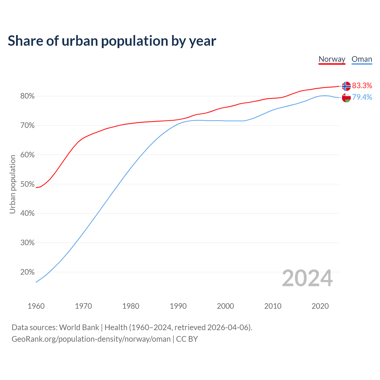 From 2004 to 2024, the share of urban population changed from 77.6% to 83.3% in Norway and from 71.5% to 79.4% in Oman.