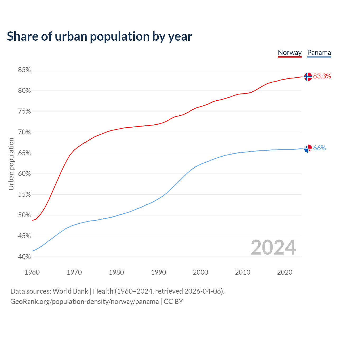 From 2004 to 2024, the share of urban population changed from 77.6% to 83.3% in Norway and from 63.8% to 66% in Panama.