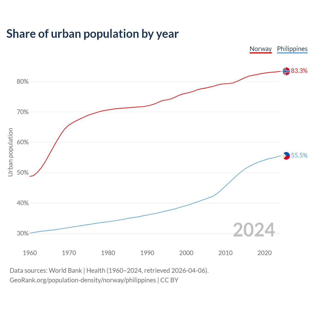 From 2004 to 2024, the share of urban population changed from 77.6% to 83.3% in Norway and from 40.9% to 55.5% in the Philippines.