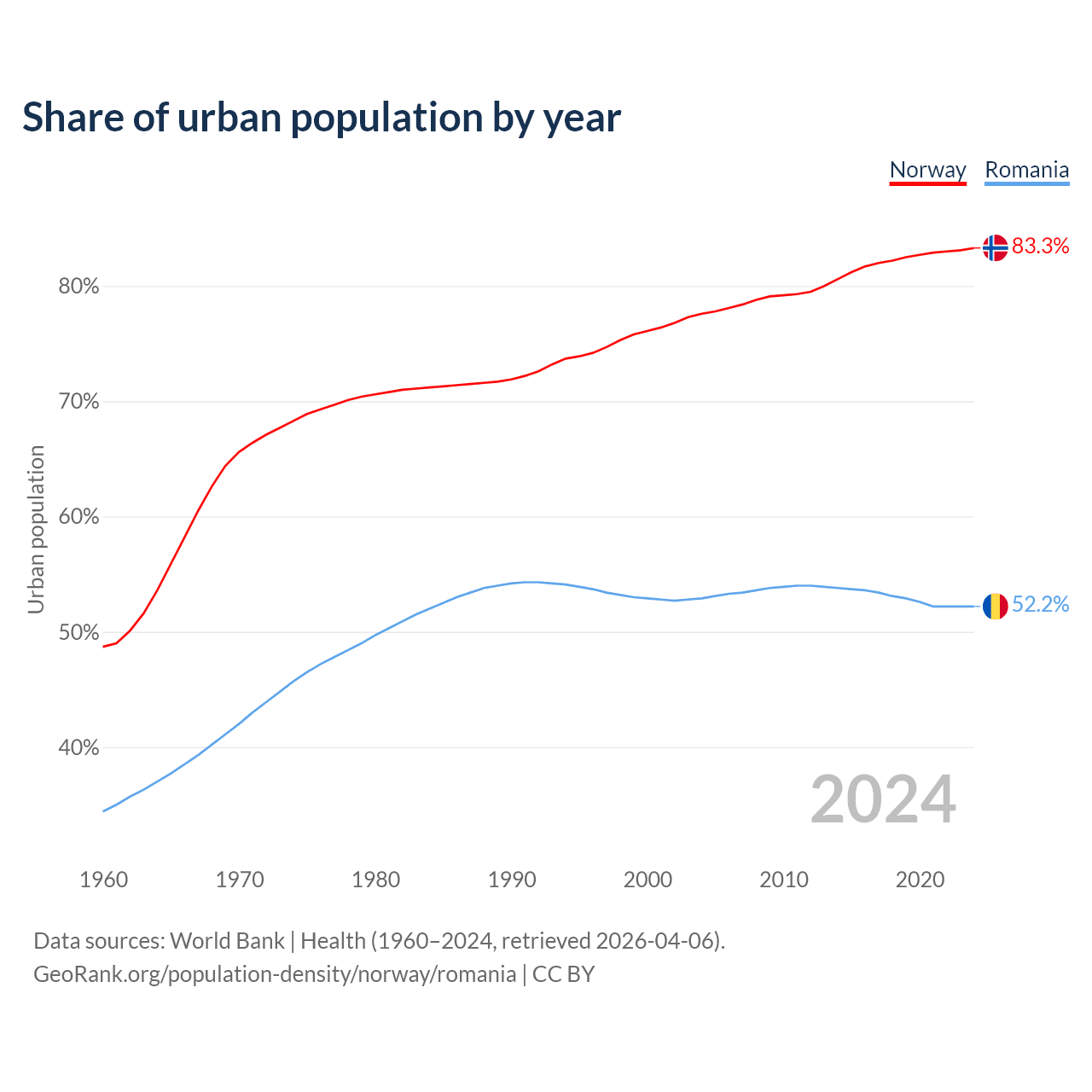 From 2004 to 2024, the share of urban population changed from 77.6% to 83.3% in Norway and from 52.9% to 52.2% in Romania.