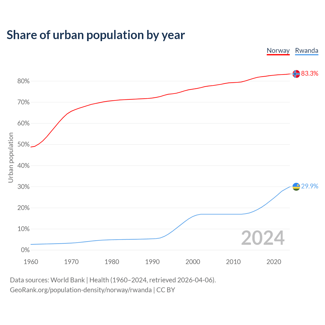 From 2004 to 2024, the share of urban population changed from 77.6% to 83.3% in Norway and from 16.9% to 29.9% in Rwanda.