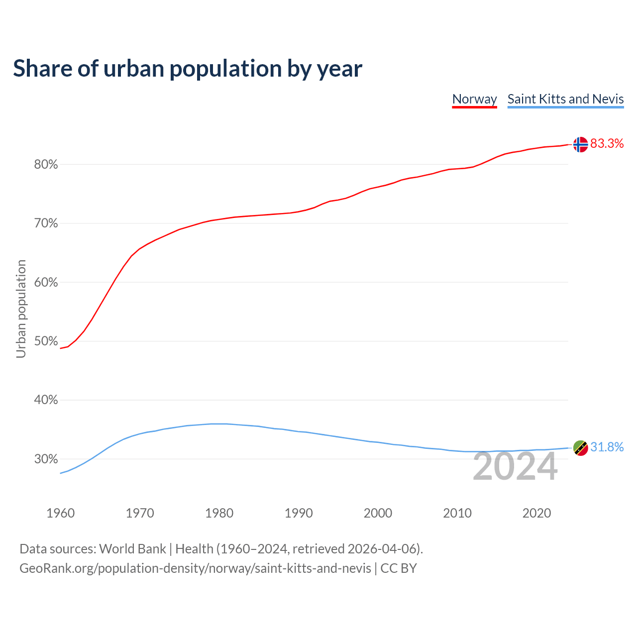 From 2004 to 2024, the share of urban population changed from 77.6% to 83.3% in Norway and from 32.1% to 31.8% in Saint Kitts and Nevis.