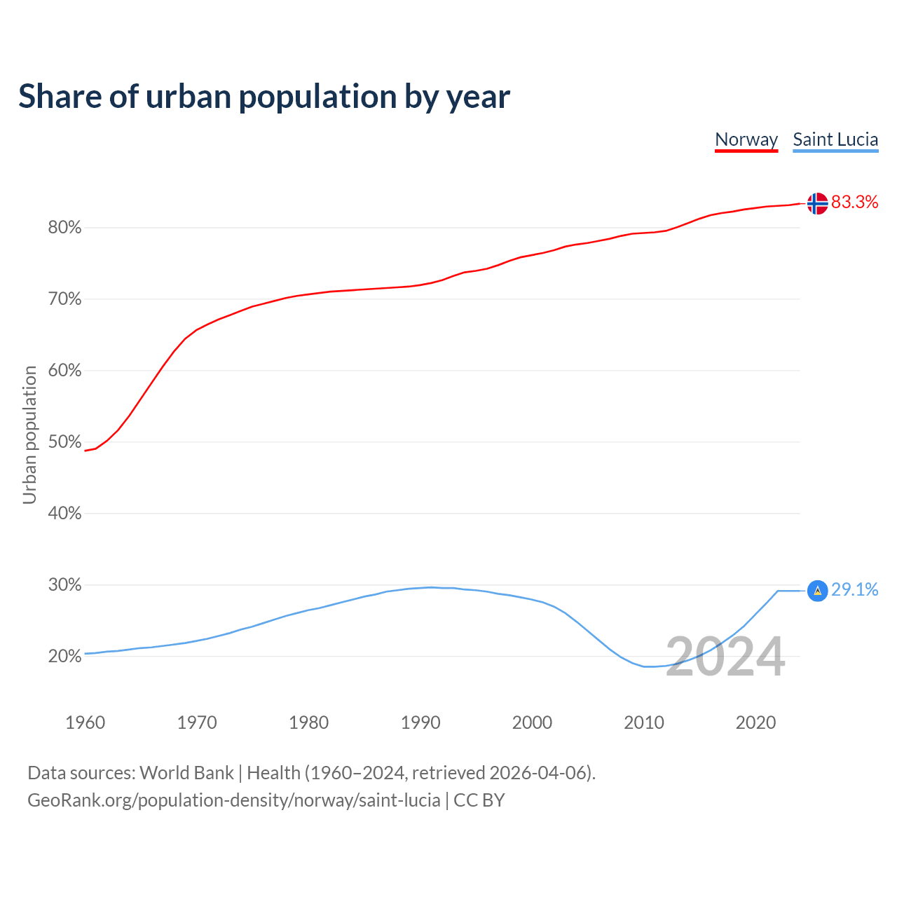 From 2004 to 2024, the share of urban population changed from 77.6% to 83.3% in Norway and from 24.8% to 29.1% in Saint Lucia.