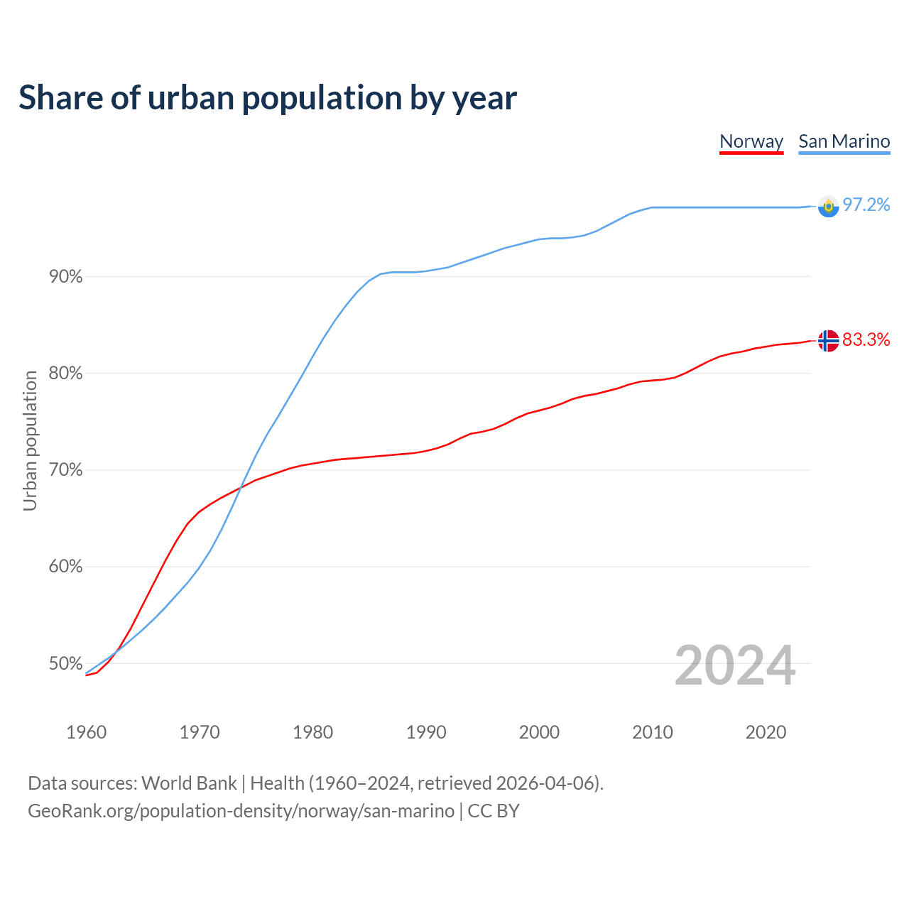From 2004 to 2024, the share of urban population changed from 77.6% to 83.3% in Norway and from 94.2% to 97.2% in San Marino.