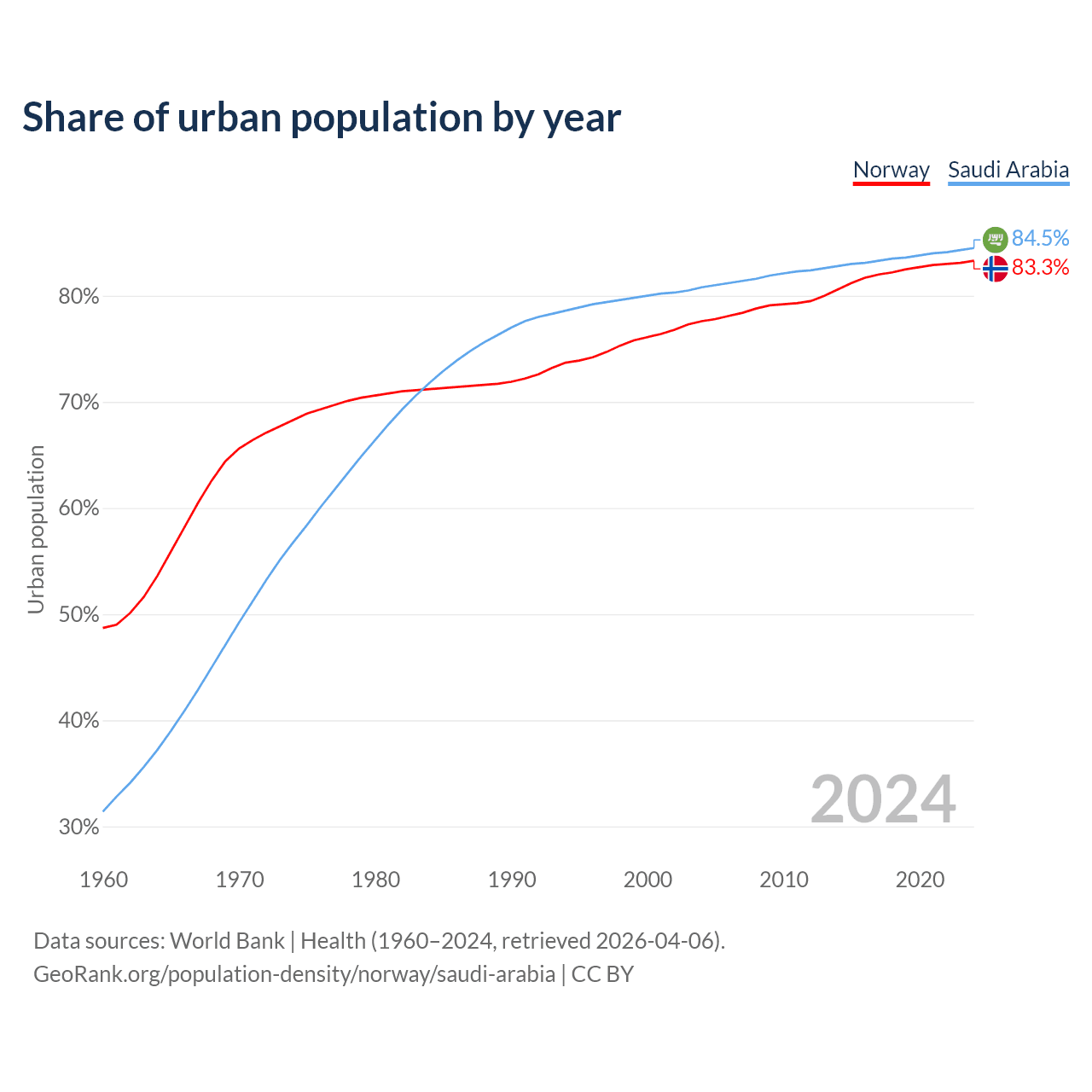 From 2004 to 2024, the share of urban population changed from 77.6% to 83.3% in Norway and from 80.8% to 84.5% in Saudi Arabia.