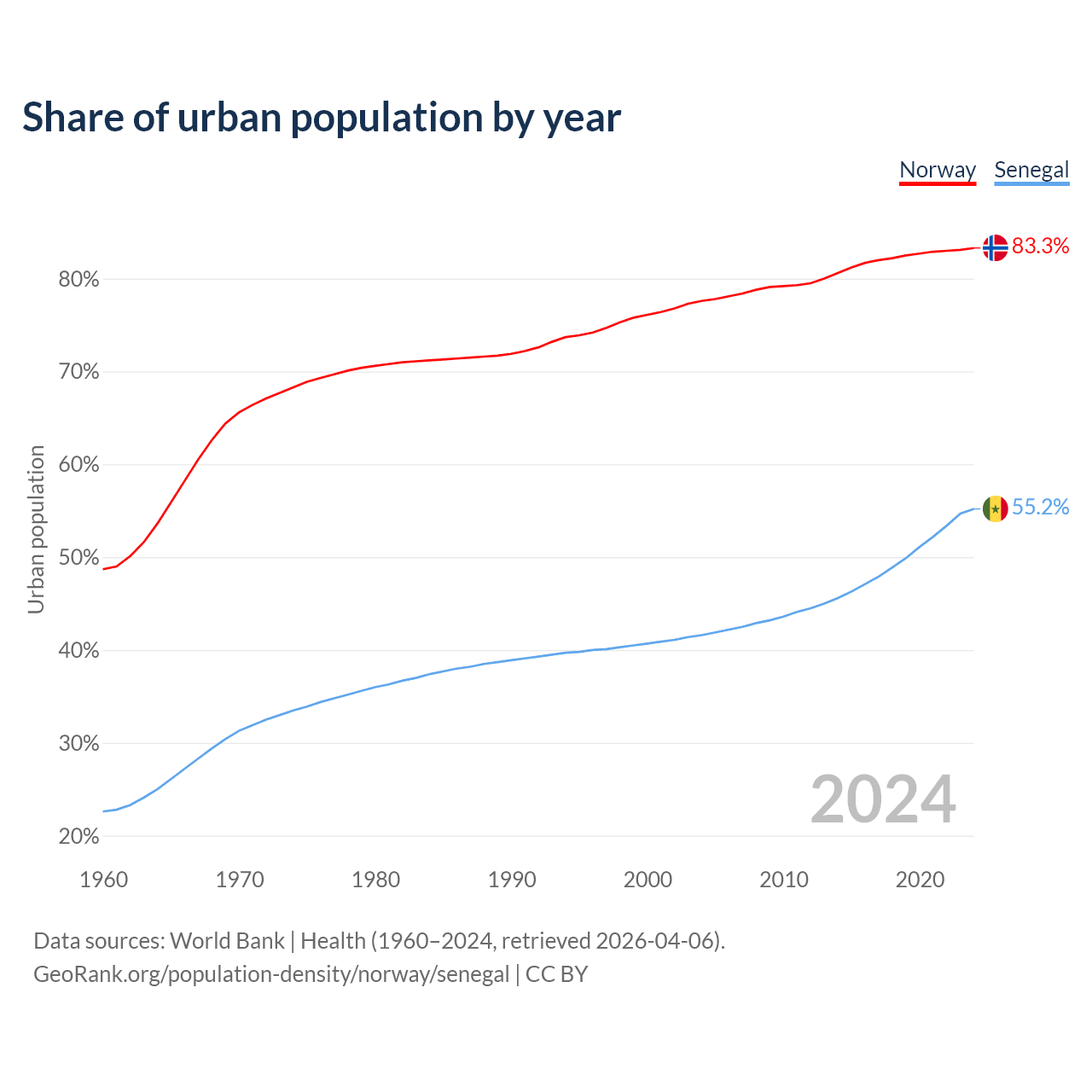 From 2004 to 2024, the share of urban population changed from 77.6% to 83.3% in Norway and from 41.6% to 55.2% in Senegal.