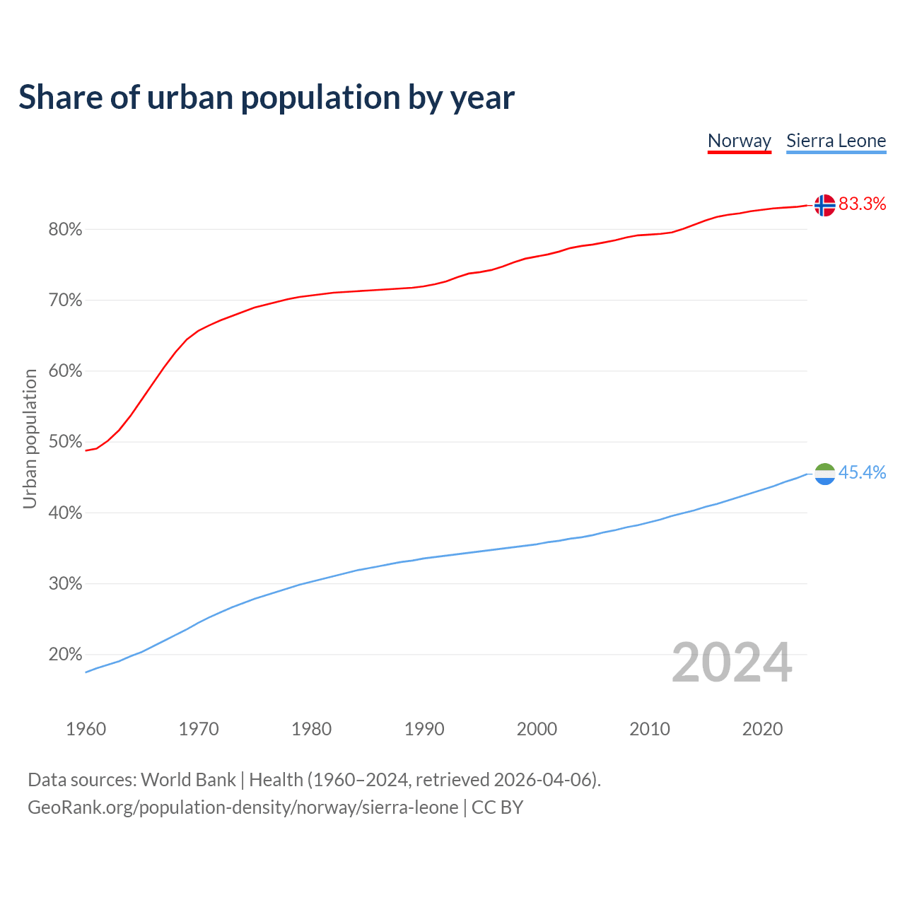 From 2004 to 2024, the share of urban population changed from 77.6% to 83.3% in Norway and from 36.5% to 45.4% in Sierra Leone.