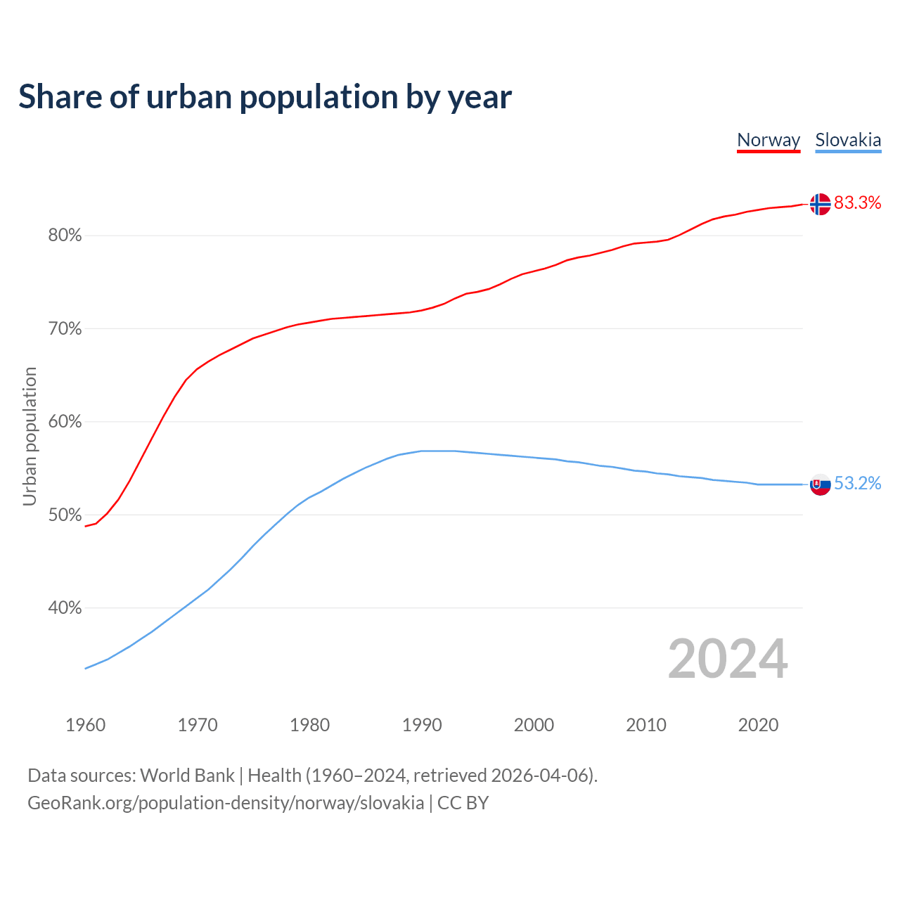 From 2004 to 2024, the share of urban population changed from 77.6% to 83.3% in Norway and from 55.6% to 53.2% in Slovakia.