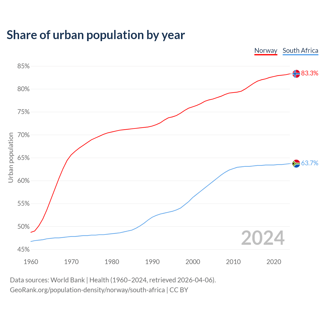 From 2004 to 2024, the share of urban population changed from 77.6% to 83.3% in Norway and from 59.1% to 63.7% in South Africa.