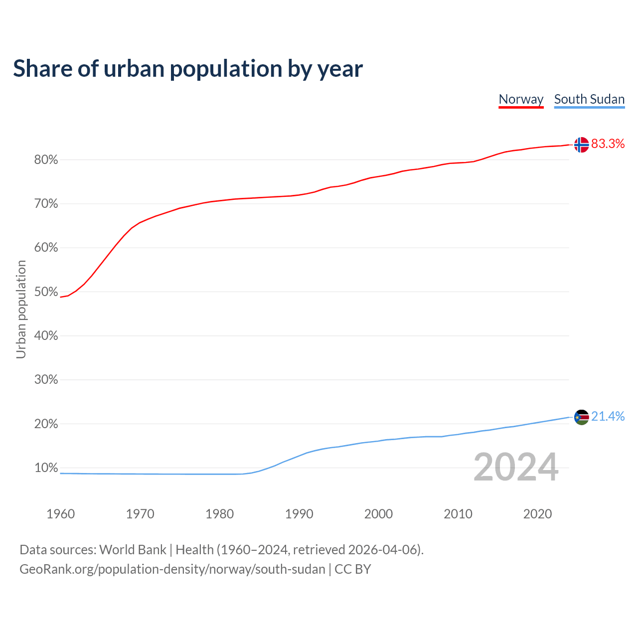 From 2004 to 2024, the share of urban population changed from 77.6% to 83.3% in Norway and from 16.8% to 21.4% in South Sudan.