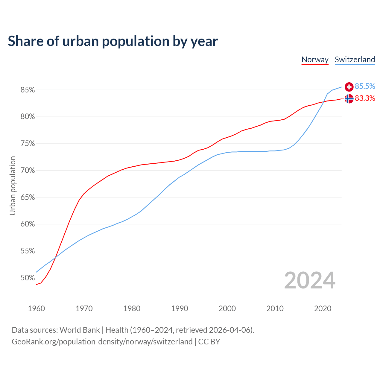 From 2004 to 2024, the share of urban population changed from 77.6% to 83.3% in Norway and from 73.5% to 85.5% in Switzerland.