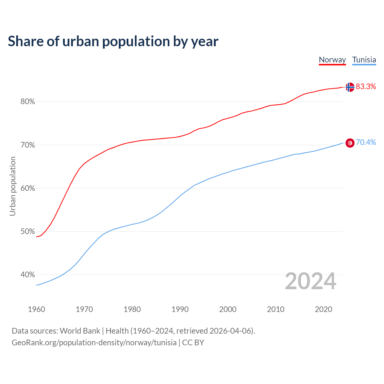 From 2004 to 2024, the share of urban population changed from 77.6% to 83.3% in Norway and from 64.9% to 70.4% in Tunisia.