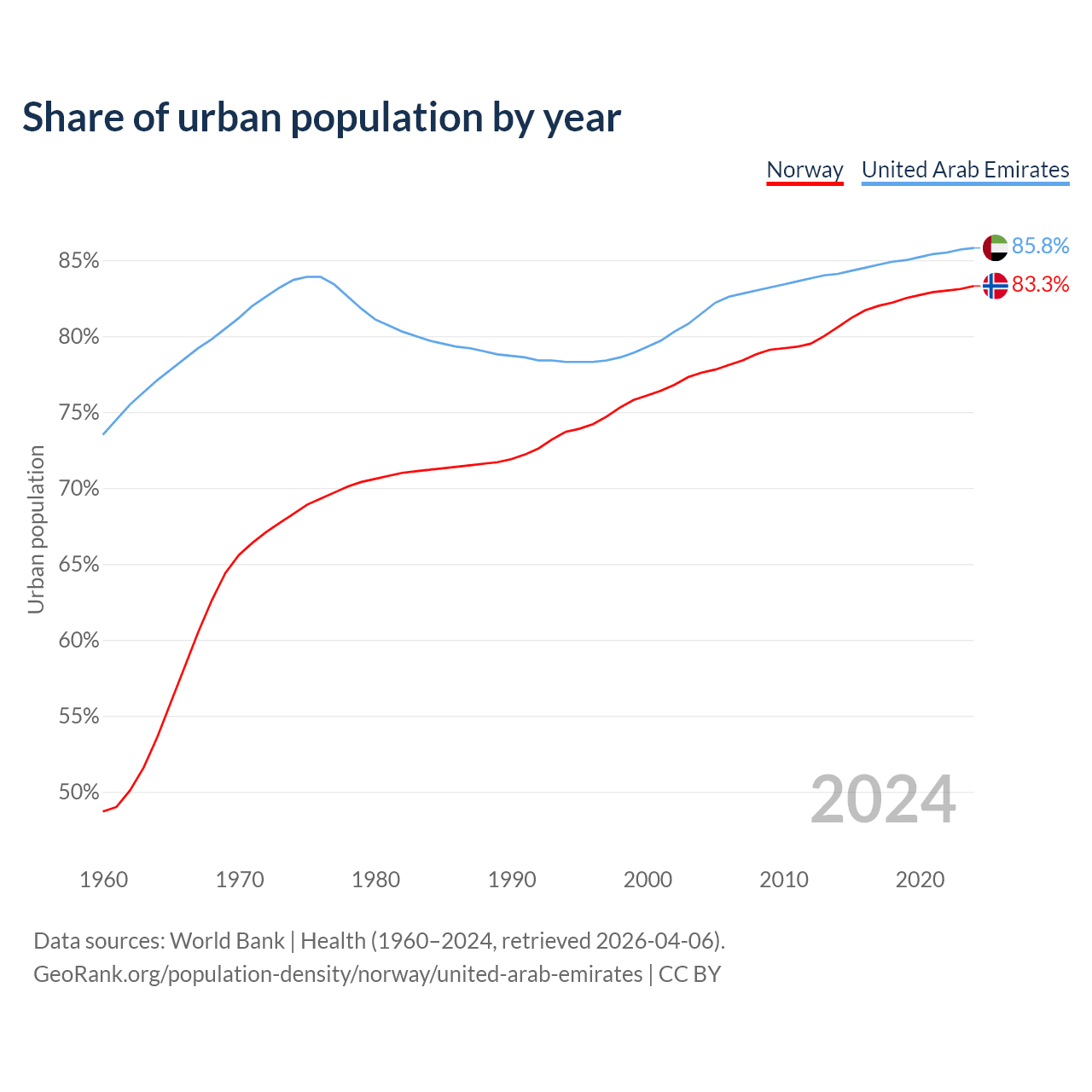 From 2004 to 2024, the share of urban population changed from 77.6% to 83.3% in Norway and from 81.5% to 85.8% in the United Arab Emirates.