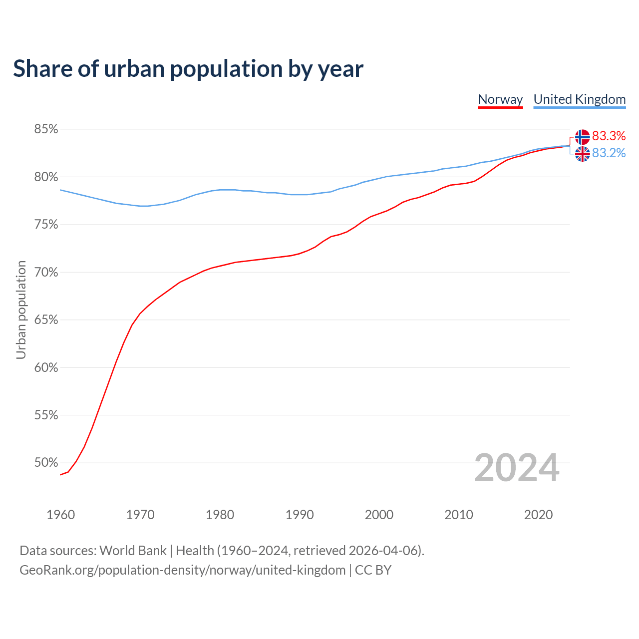 From 2004 to 2024, the share of urban population changed from 77.6% to 83.3% in Norway and from 80.3% to 83.2% in the United Kingdom.