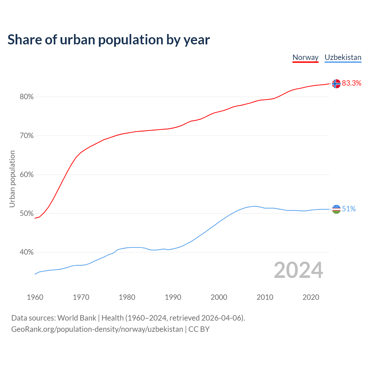From 2004 to 2024, the share of urban population changed from 77.6% to 83.3% in Norway and from 50.6% to 51% in Uzbekistan.