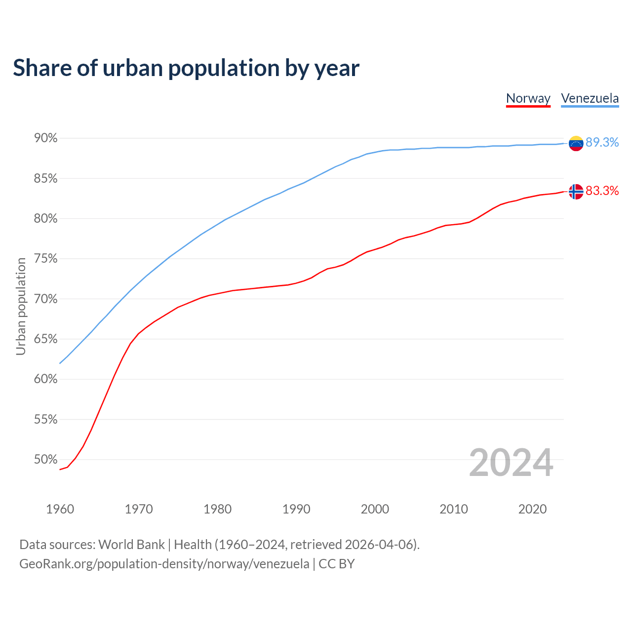 From 2004 to 2024, the share of urban population changed from 77.6% to 83.3% in Norway and from 88.6% to 89.3% in Venezuela.