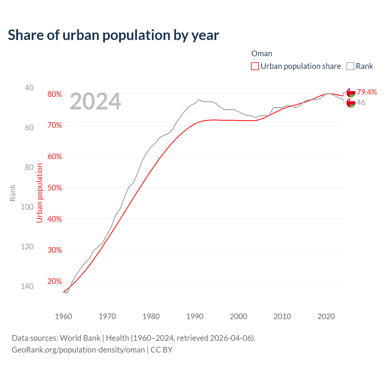 This chart shows the share of urban population in Oman from 1960 to 2024: 16.4% lived in urban areas in 1960, 71.5% in 2000, and 79.4% in 2024.