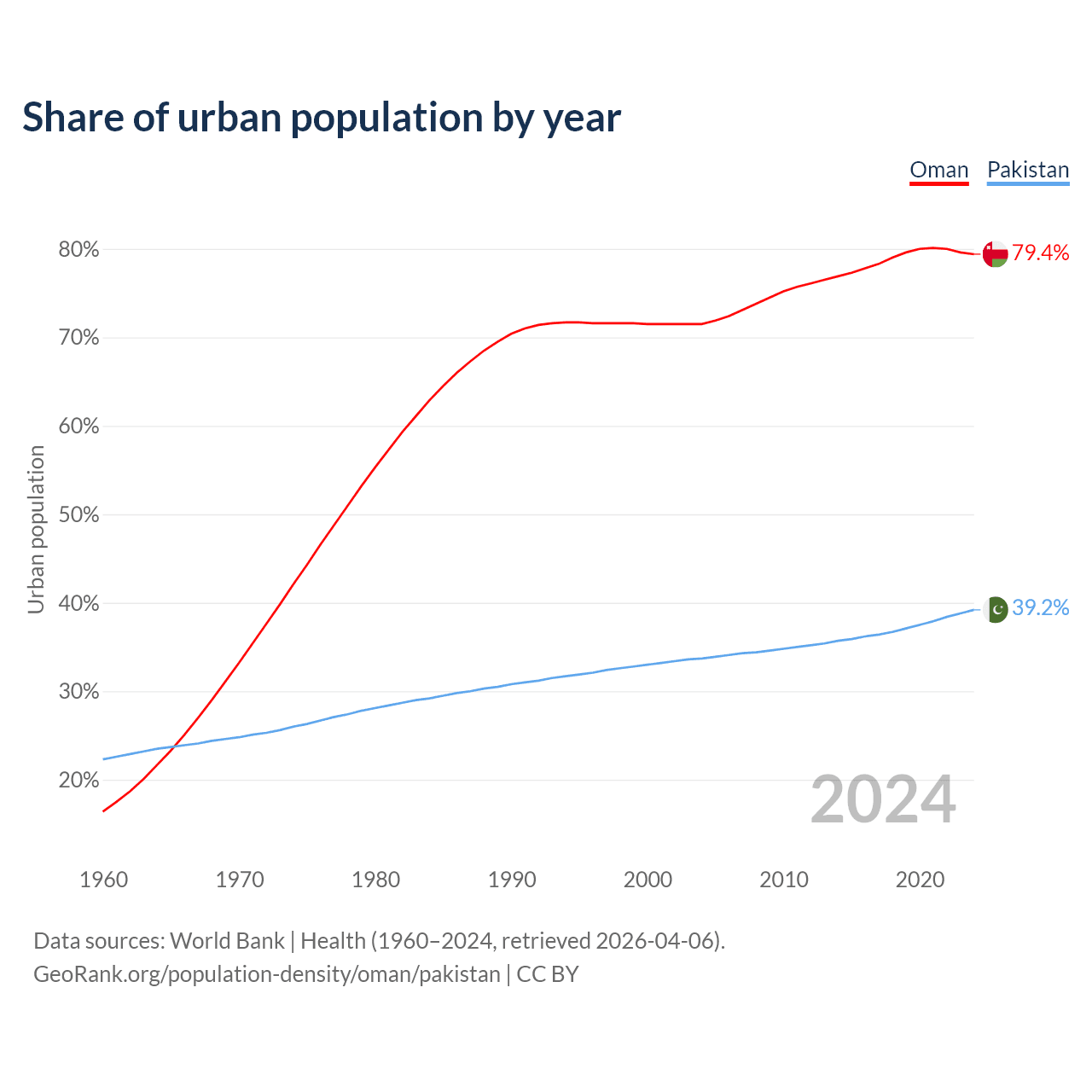 From 2004 to 2024, the share of urban population changed from 71.5% to 79.4% in Oman and from 33.7% to 39.2% in Pakistan.
