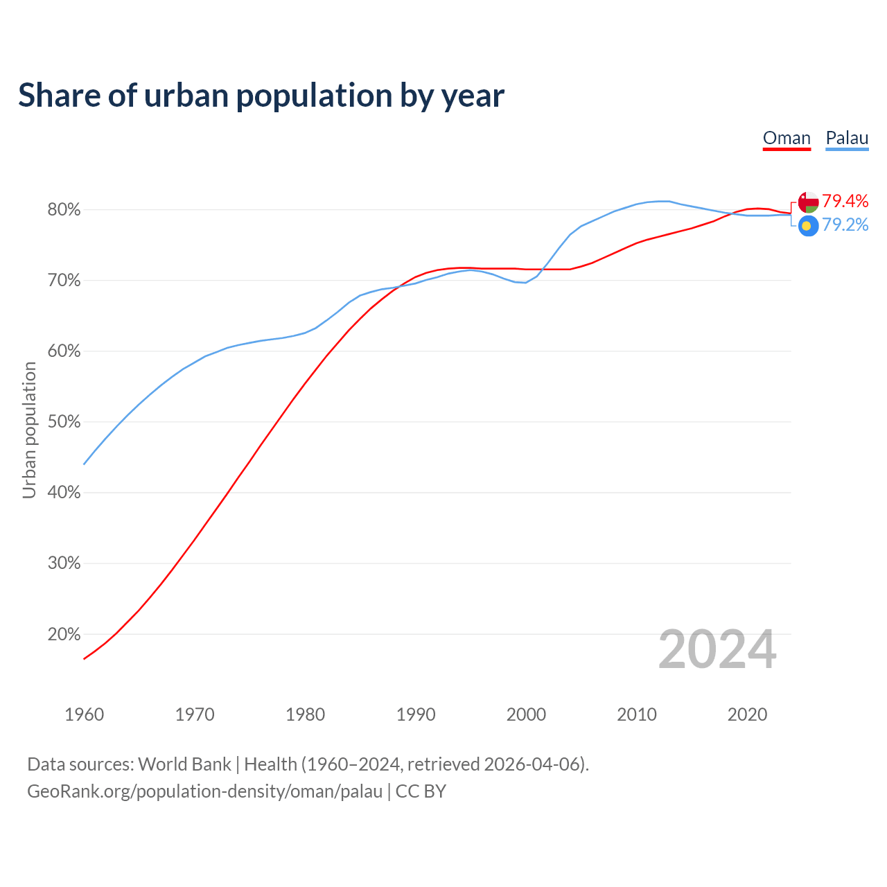 From 2004 to 2024, the share of urban population changed from 71.5% to 79.4% in Oman and from 76.4% to 79.2% in Palau.