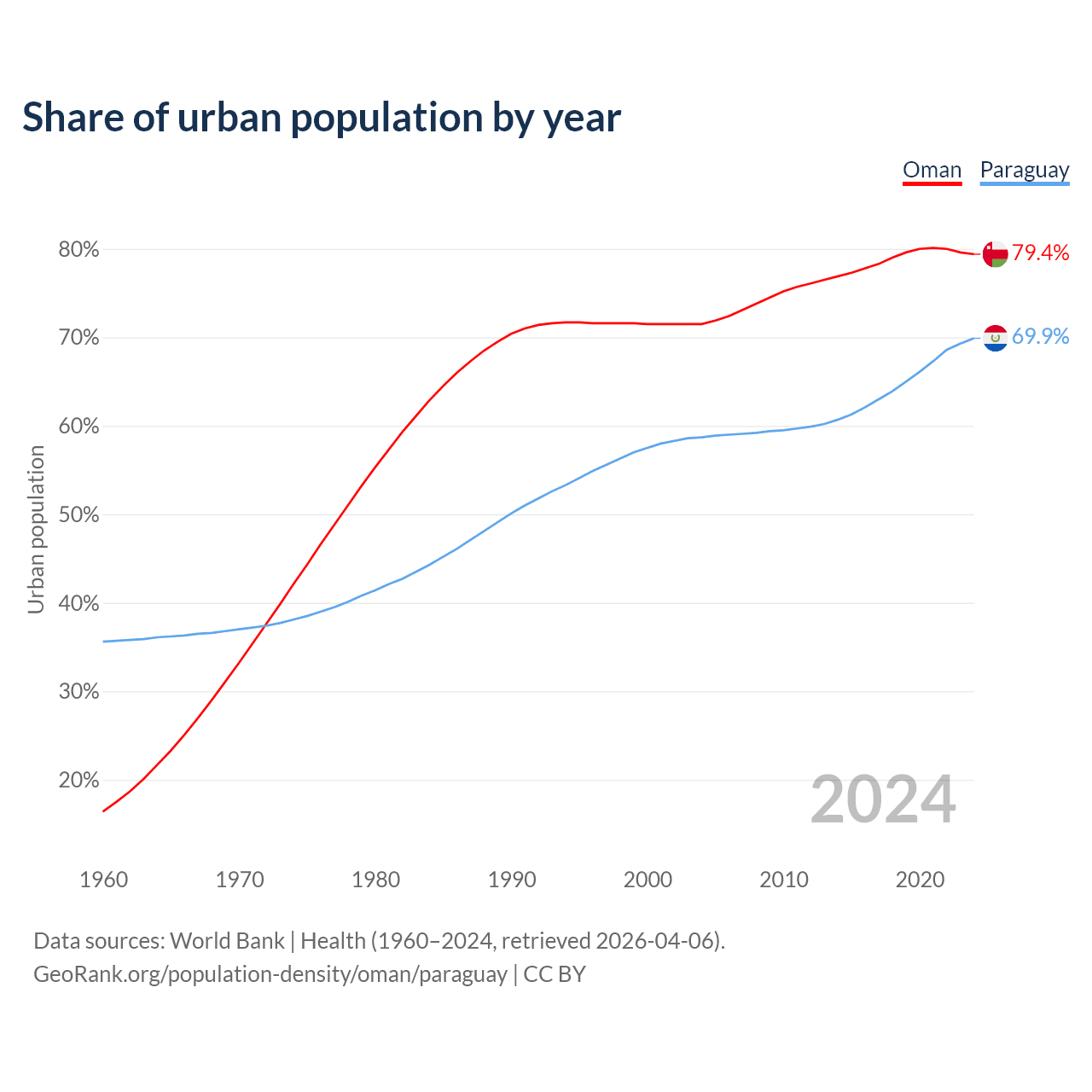 From 2004 to 2024, the share of urban population changed from 71.5% to 79.4% in Oman and from 58.7% to 69.9% in Paraguay.