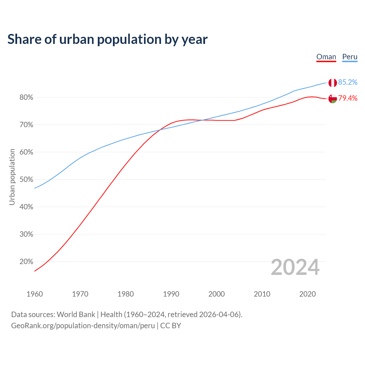 From 2004 to 2024, the share of urban population changed from 71.5% to 79.4% in Oman and from 74.4% to 85.2% in Peru.