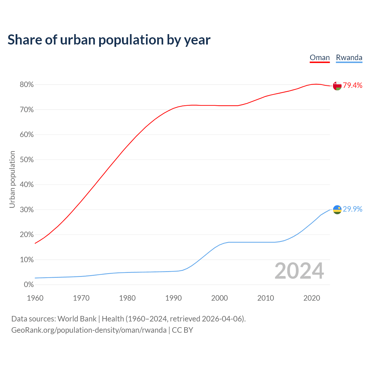 From 2004 to 2024, the share of urban population changed from 71.5% to 79.4% in Oman and from 16.9% to 29.9% in Rwanda.
