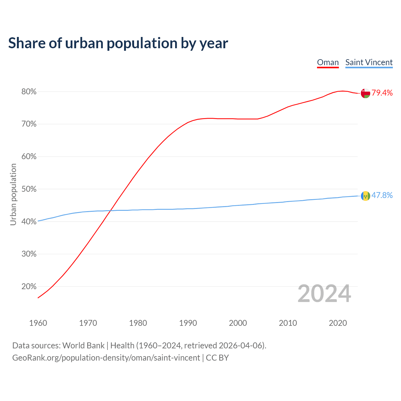 From 2004 to 2024, the share of urban population changed from 71.5% to 79.4% in Oman and from 45.4% to 47.8% in Saint Vincent.